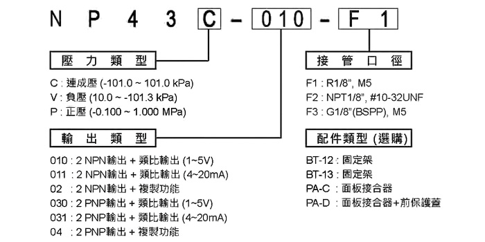| 項目 | 單位 | NP43P (正壓) | NP43V (負壓) | NP43C (連成壓) | |||||